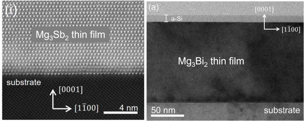 ←作製したMg3Sb2薄膜とMg3Bi2薄膜